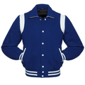 Premium royal blue varsity jacket featuring a soft wool body, white contrast shoulder stripes, ribbed cuffs/hem, and classic snap-button closure. Designed for comfort, durability, and iconic college-style looks.