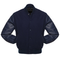 A premium varsity jacket designed with a deep navy blue wool body and matching real leather sleeves. Modern athletic fit featuring rib-knit details and smooth snap closure — the perfect mix of heritage sports style & everyday fashion.
