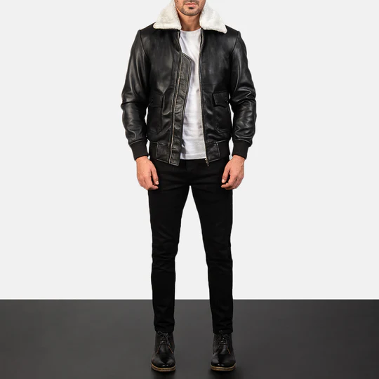 Airin G-1 bomber, men’s black leather jacket, shearling collar jacket, aviator bomber, pilot style jacket, winter leather bomber, rib knit cuffs, zip front jacket, men’s outerwear, classic bomber jacket, leather flight jacket, trendy menswear, casual leather jacket, biker-inspired bomber, premium leather coat