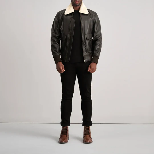 men leather bomber, g-1 jacket, aviator jacket, black leather jacket, shearling collar jacket, flight bomber, ribbed cuffs, zip front jacket, winter leather outerwear, classic bomber style, casual biker look, heritage leather jacket