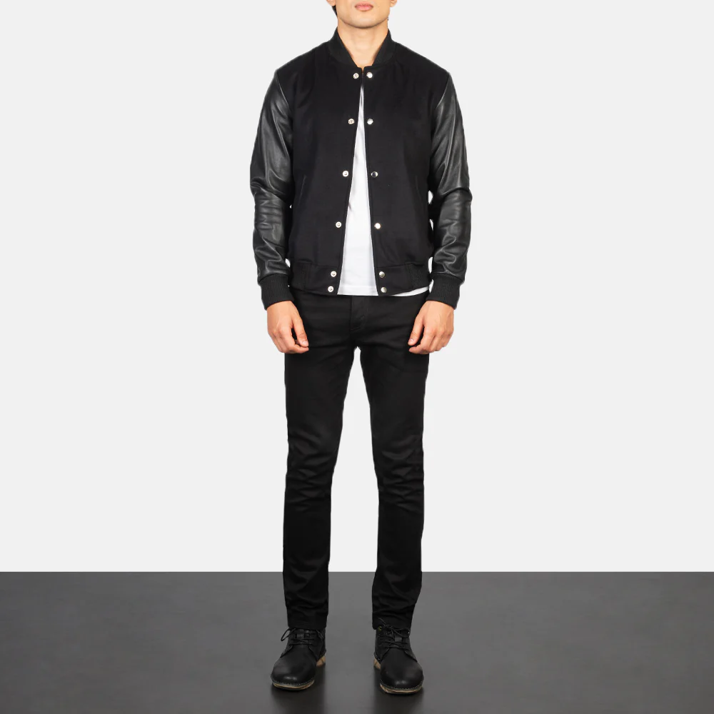 black varsity jacket, men’s hybrid jacket, wool body leather sleeves, all black bomber, snap button varsity, minimalist outerwear, streetwear jacket, classic letterman style, rib knit collar, everyday casual jacket, vaxton varsity, monochrome jacket