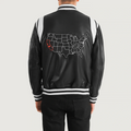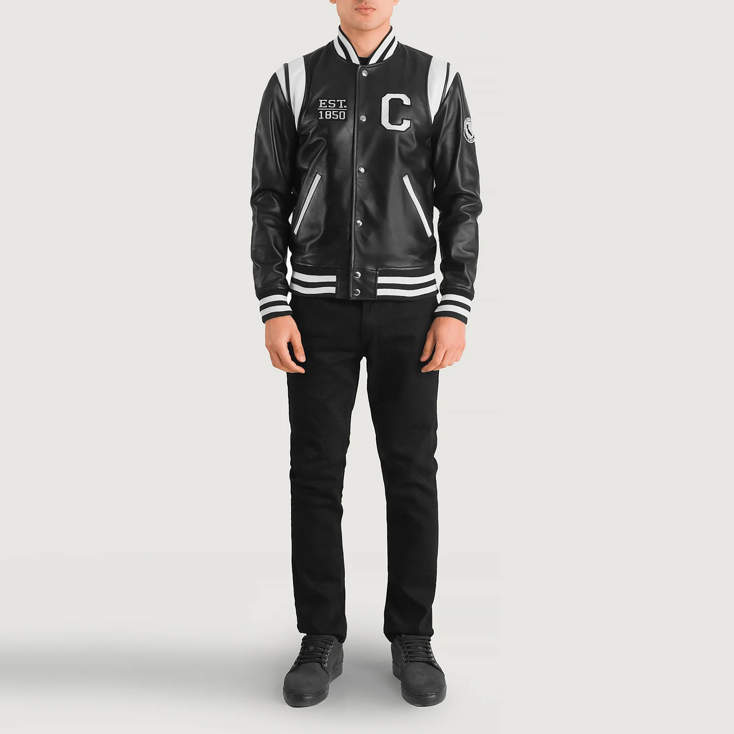 Men’s varsity jacket, black leather varsity, California varsity jacket, Liberté jacket, letterman style, chenille patch jacket, “C” varsity, striped rib trim, snap button jacket, streetwear outerwear, USA map back embroidery, college bomber jacket, contrast shoulder panels, modern classic jacket