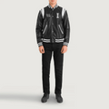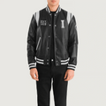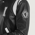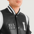 Black leather varsity body with smooth, premium look