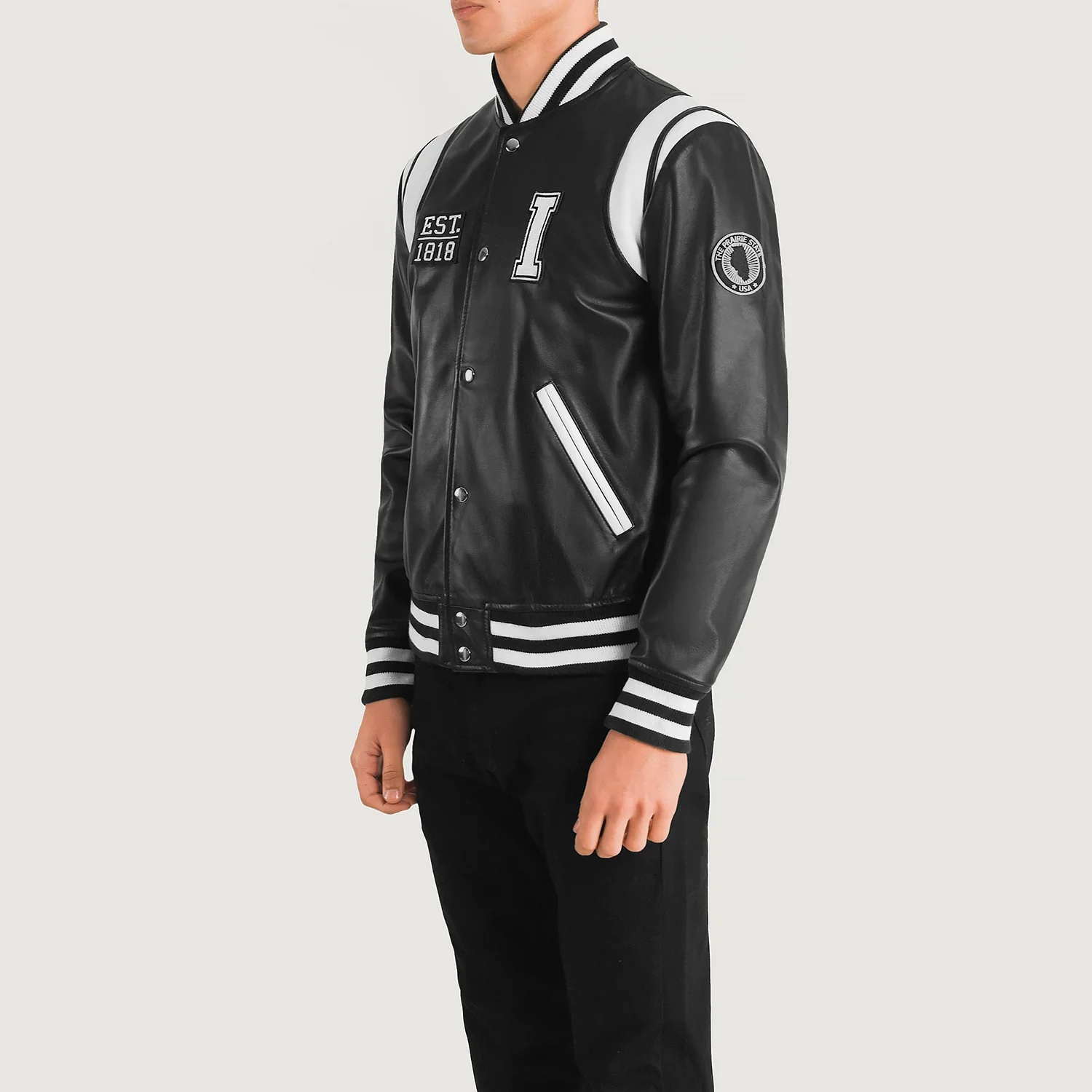Rep your Prairie State pride in standout varsity style. This black leather jacket pairs a sleek, smooth finish with sharp white contrast panels and classic rib-knit striping. Varsity patches on the chest and sleeve add collegiate energy, while the embroidered U.S. map on the back highlights Illinois in bold red for a statement look. Finished with snap-button closure and angled welt pockets, it’s built for everyday wear with a heritage edge.
