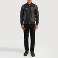 USA varsity jacket, black leather letterman, patriotic jacket, EST 1776 patch, U patch jacket, men’s bomber varsity, red black varsity, American flag sleeve patch, embroidered US map back, streetwear leather jacket, classic snap front jacket, mens varsity outerwear, Liberté collection, heritage style jacket