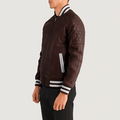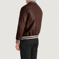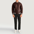 A sleek maroon leather varsity jacket with a modern bomber silhouette. Designed with quilted shoulder panels and classic striped rib-knit trims, it delivers a bold, sporty look that works for everyday streetwear or night-out layering.