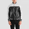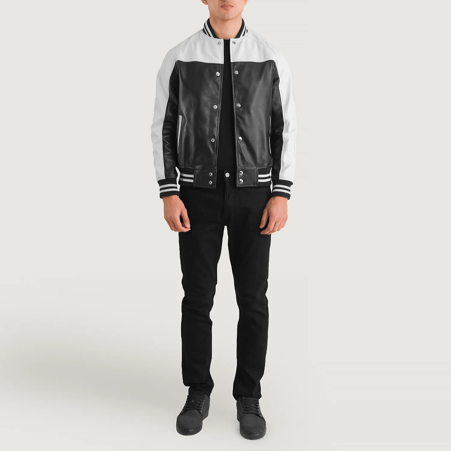 Men’s varsity jacket, black and white leather jacket, two-tone bomber, snap button jacket, streetwear outerwear, retro varsity style, winter leather jacket, casual biker varsity, rib knit trim jacket, urban fashion menswear