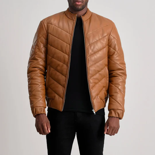 The Travis Tan Leather Puffer Jacket brings winter warmth with a bold, clean finish. Made from genuine sheepskin leather, it features angled quilted puffer paneling that adds structure while locking in heat. The rich tan tone gives a premium modern look, and the stand collar keeps cold air out for everyday winter comfort.