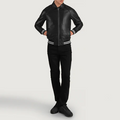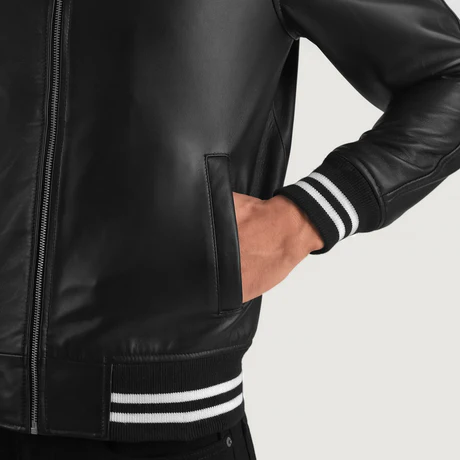black leather varsity jacket, men’s bomber jacket, striped rib knit, classic letterman style, zip front jacket, minimalist streetwear, casual outerwear, smart casual jacket, raglan sleeve bomber, everyday leather jacket, modern varsity look, men’s black jacket