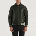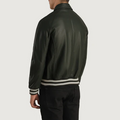 Men’s Walton Green Leather Varsity Jacket – Classic Zip-Front Bomber with Striped Rib Trim