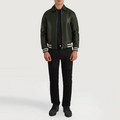 Walton Jacket, Men’s Green Leather Jacket, Varsity Bomber, Leather Baseball Jacket, Zip Front Jacket, Ribbed Cuff Bomber, Striped Hem Varsity, Casual Leather Outerwear, Men’s Streetwear Jacket, Classic Bomber Style, Athletic-Inspired Jacket, Everyday Leather Jacket