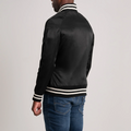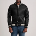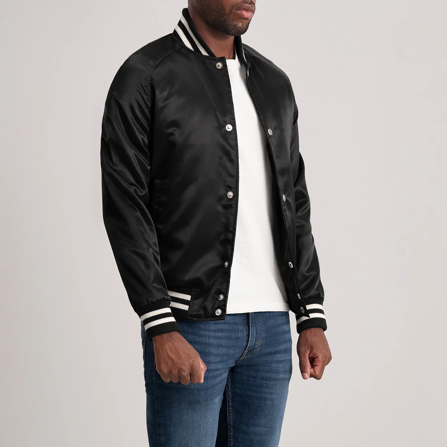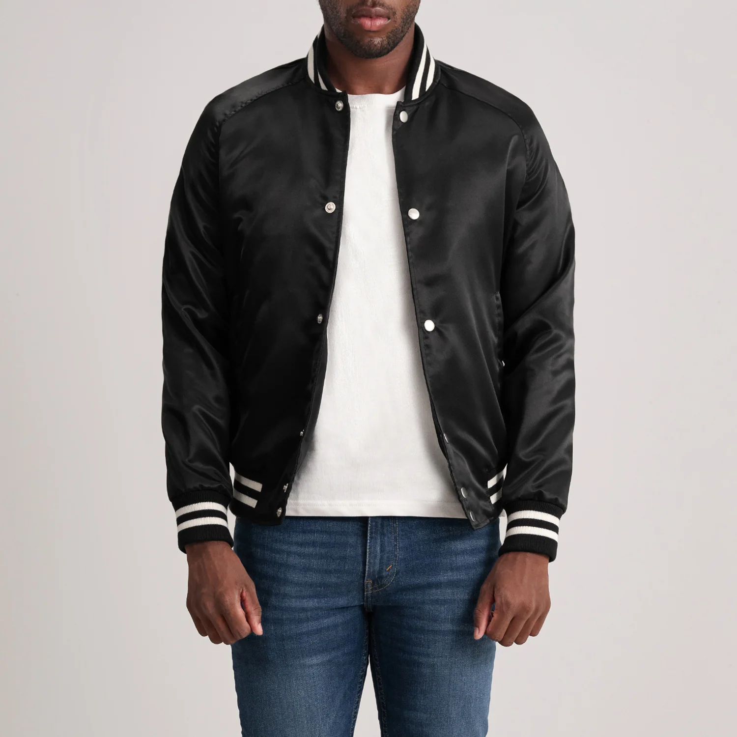 Level up your everyday look with this sleek black varsity jacket. Crafted in a smooth satin-finish shell, it brings a clean, modern edge to the classic bomber silhouette. The snap-front closure and minimalist design keep it versatile, while the black-and-white striped ribbed collar, cuffs, and hem add just the right varsity punch. Easy to throw on over a tee or hoodie, this jacket is built for sharp casual style all year round.