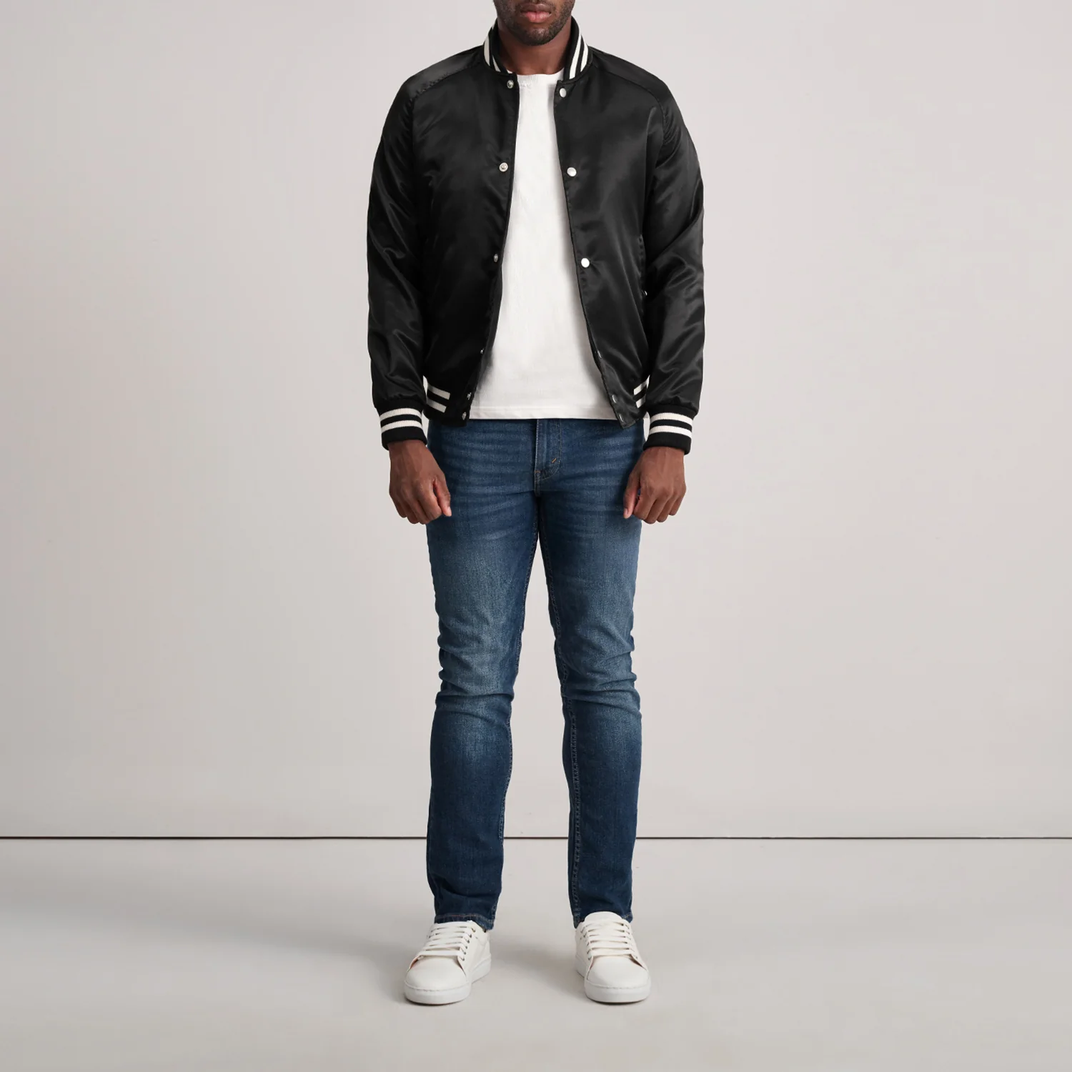 men varsity jacket, black bomber jacket, satin varsity jacket, snap button jacket, ribbed stripe collar, lightweight men jacket, classic varsity style, streetwear outerwear, minimalist bomber, casual men fashion