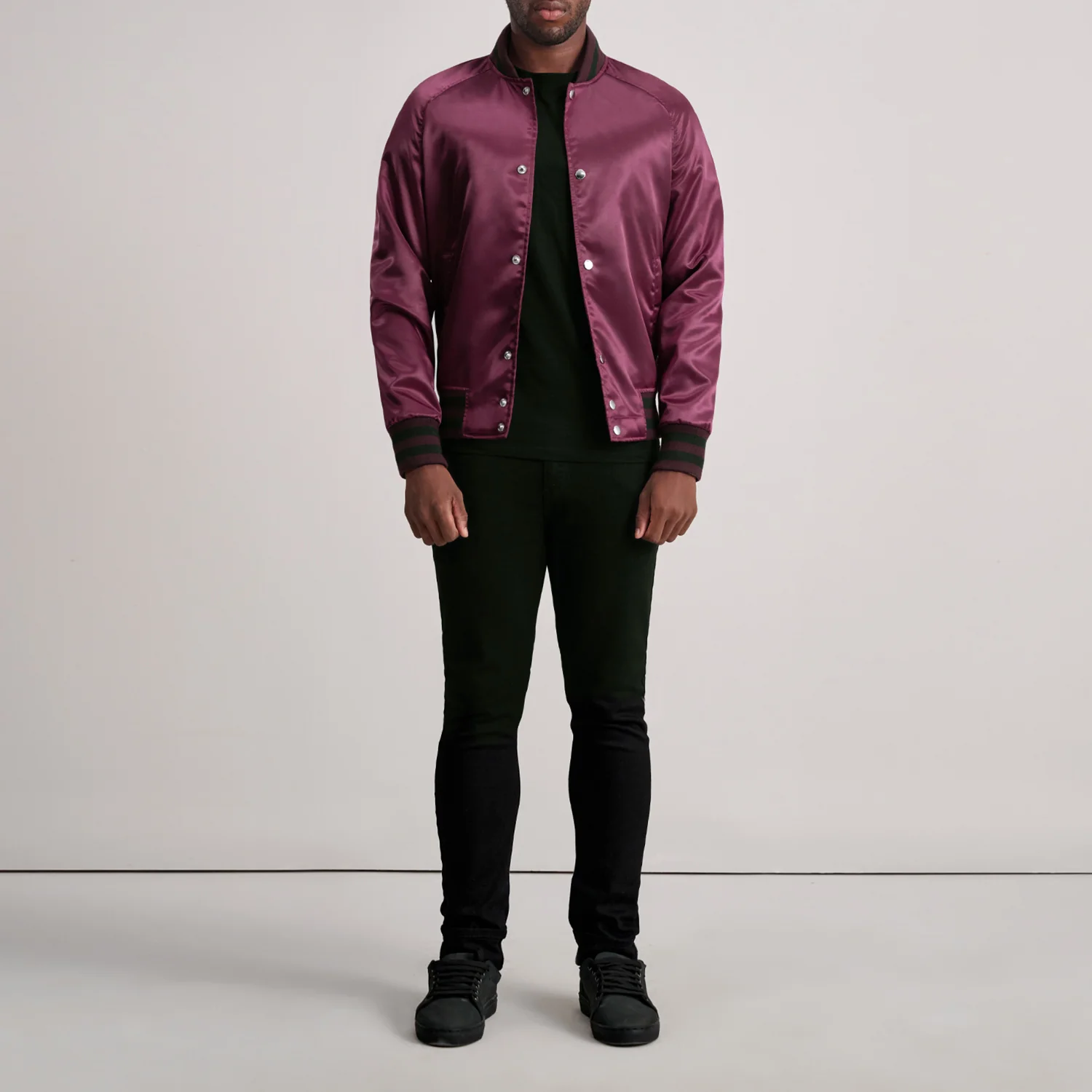 maroon varsity jacket, satin bomber jacket, men’s casual outerwear, snap button jacket, ribbed cuff bomber, striped collar jacket, streetwear varsity, lightweight men’s jacket, burgundy bomber, classic varsity style