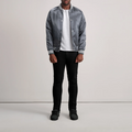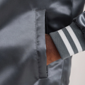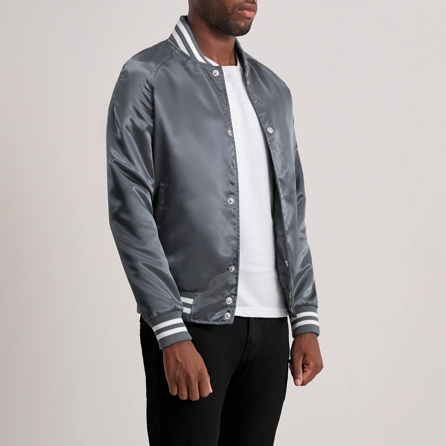Men’s varsity jacket, grey satin bomber, snap button jacket, collegiate style, ribbed striped trim, lightweight outerwear, streetwear essential, casual layering, raglan sleeve jacket, modern classic jacket