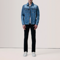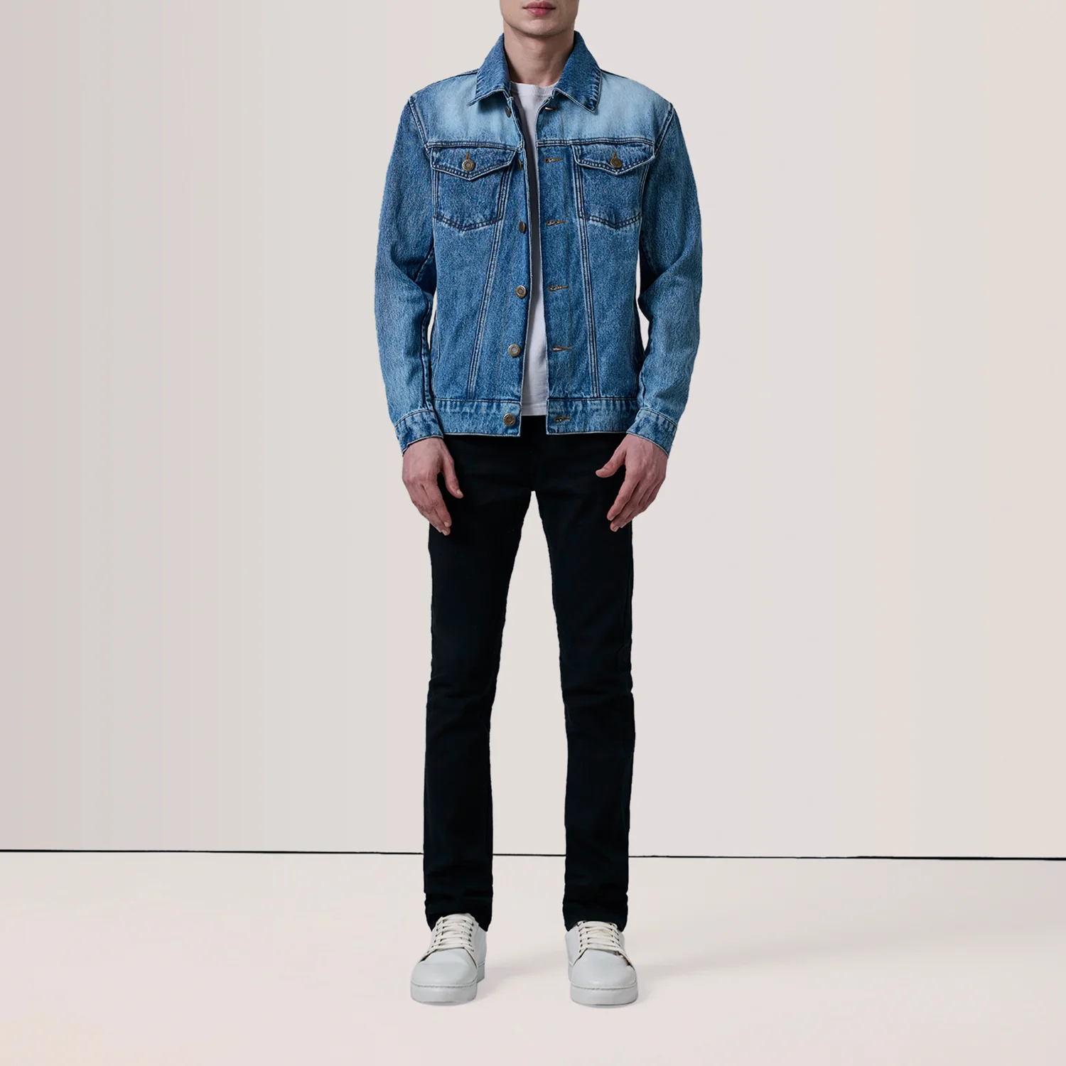 Style: trucker, jean jacket, denim jacket, light wash, ice blue, vintage style, retro, street style, mens casual, faded denim