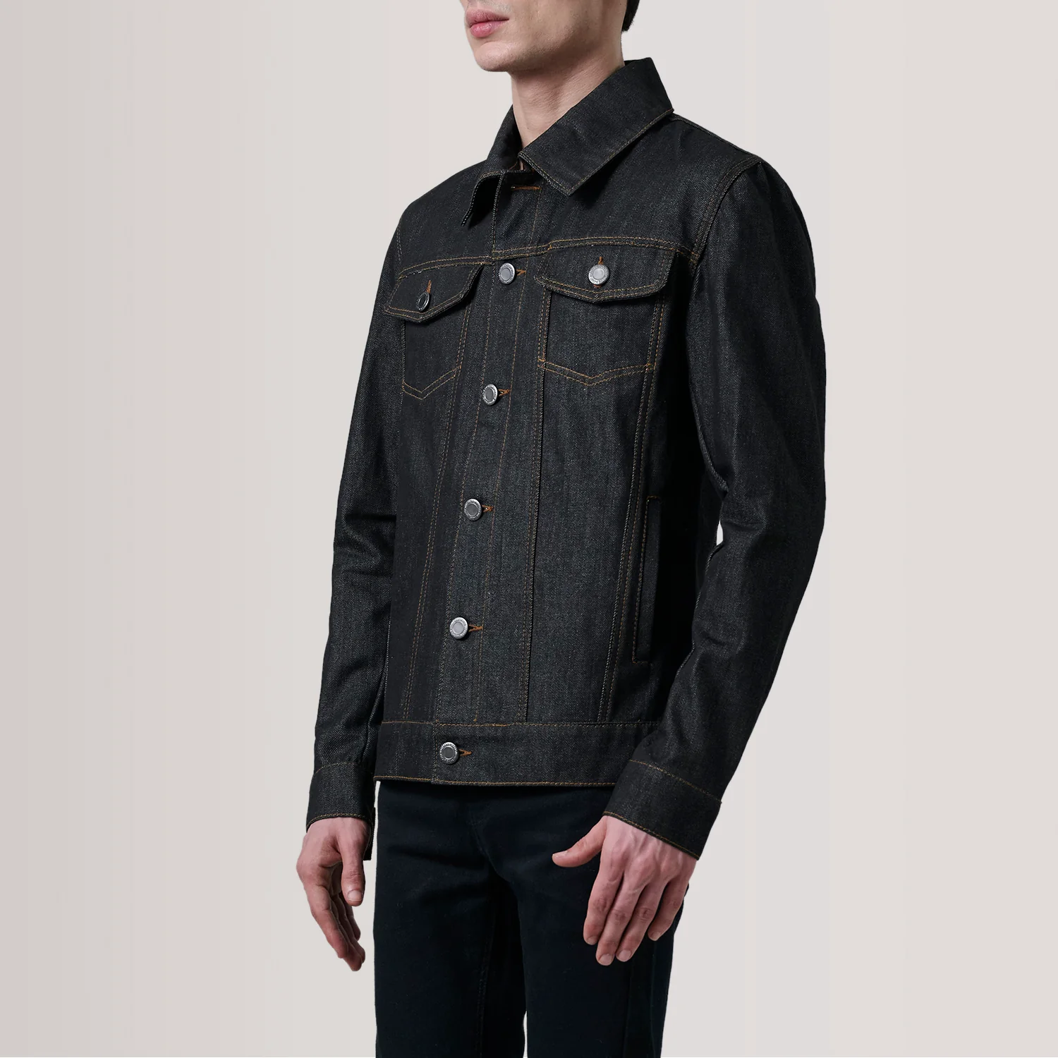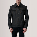 Discover our men's black denim trucker jacket featuring sharp contrast stitching. Timeless style, durable cotton, and a sleek, versatile fit. Shop now!