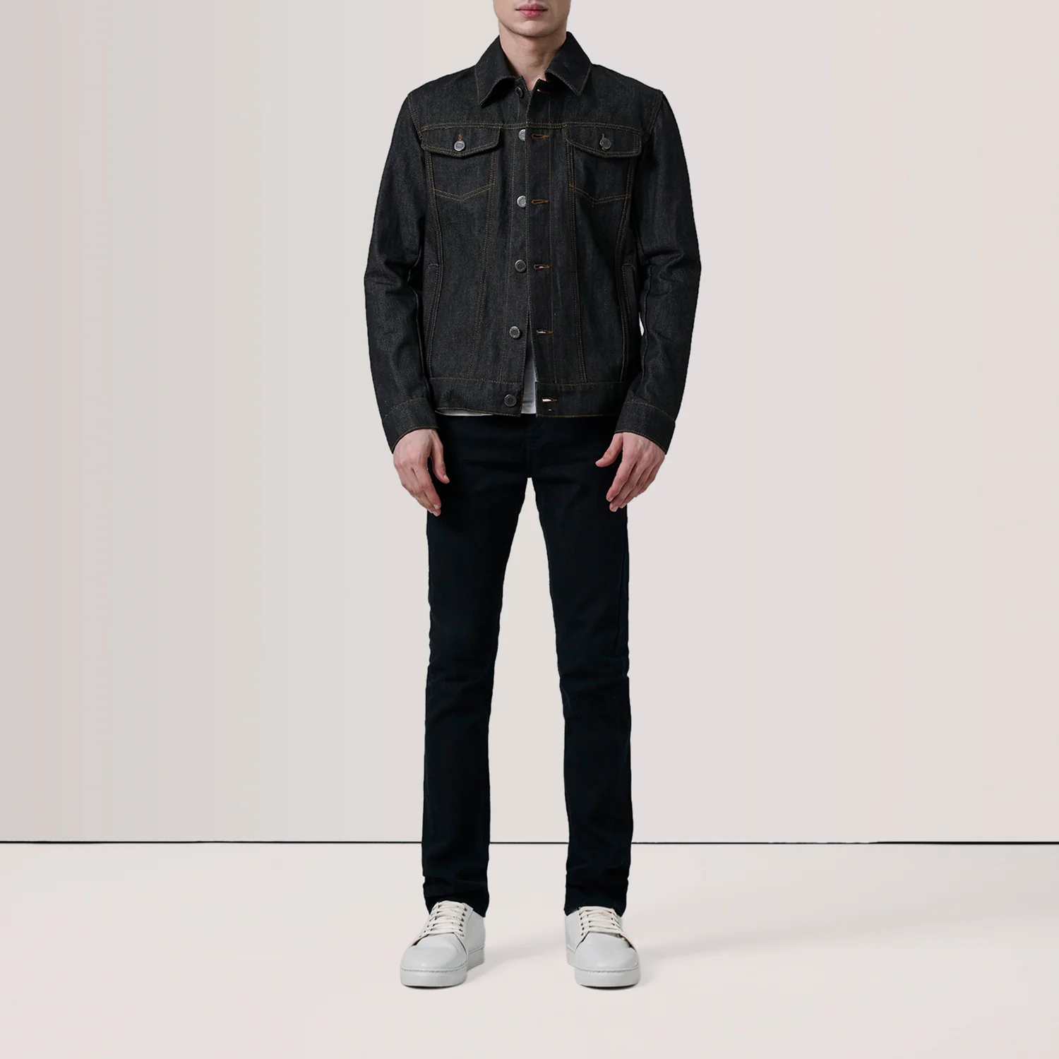 Front View: Men's Black Denim Trucker Jacket with Contrast Stitching and Gunmetal Buttons