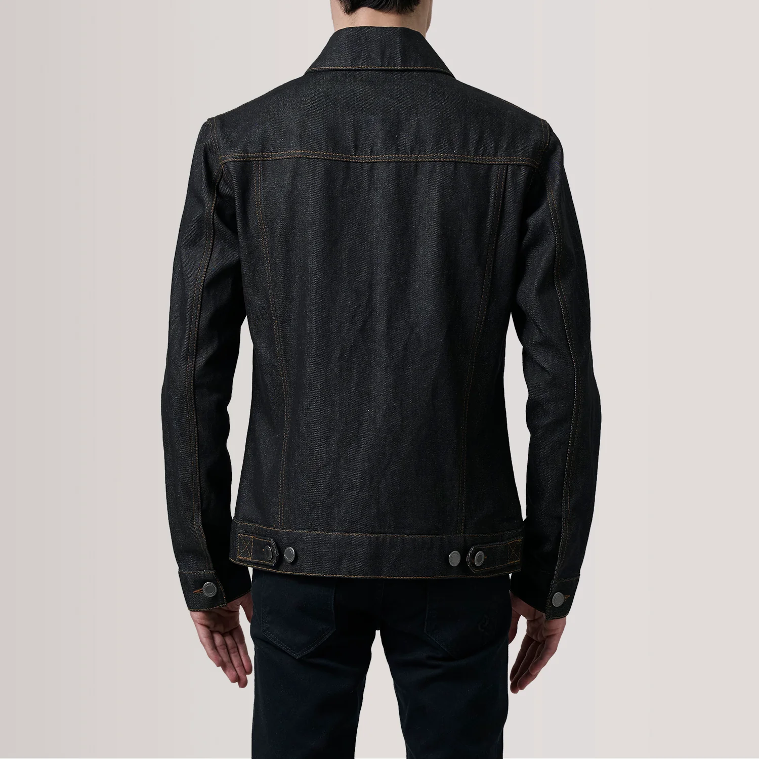 Back View: Black Denim Trucker Jacket Back View showing Contrast Stitching and Yoke Seam