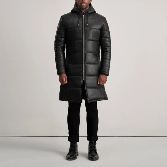 Floyd Black Hooded Leather Puffer Coat for Men | Long Winter Leather Parka